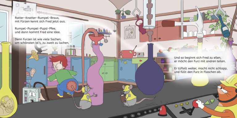 We developed the story together – humorous, quirky, and full of childlike curiosity. I was commissioned to create the illustrations. With loving details and a wink, a visual world was created around Fred, the little explorer who isn’t afraid of big questions (and little farts).